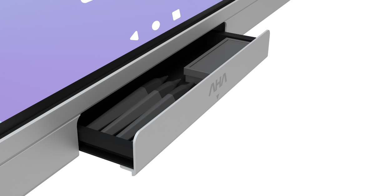 Die Integration einer Schublade als Stiftablage an der Vorderseite des Geräts bietet eine praktische Aufbewahrungsmöglichkeit für Stifte, Radierer und Fernbedienungen, ohne die Optik des Smartboards zu beeinträchtigen.